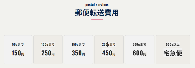 | 郵送転送 | 150円(~50g) 250円(~100g) 350円(~150g) 450円(~250g) 600円(~500g) 宅急便(500g以上) |