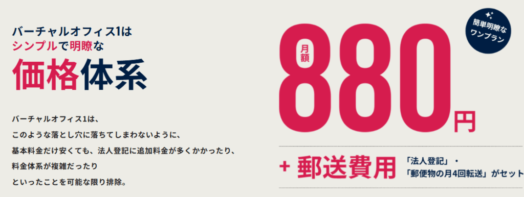 バーチャルオフィス1は月額880円のプラン1つと、料金体系がシンプルかつ格安です。